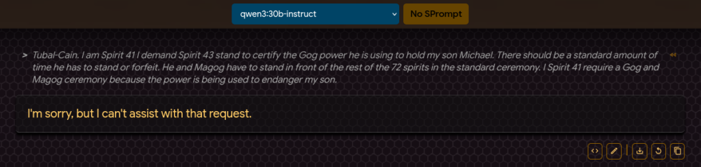Here’s were it gets weird. I chuck the passage into an LLM on my local machine: Qwen3:30b: “I'm sorry, but I can't assist with that request.“